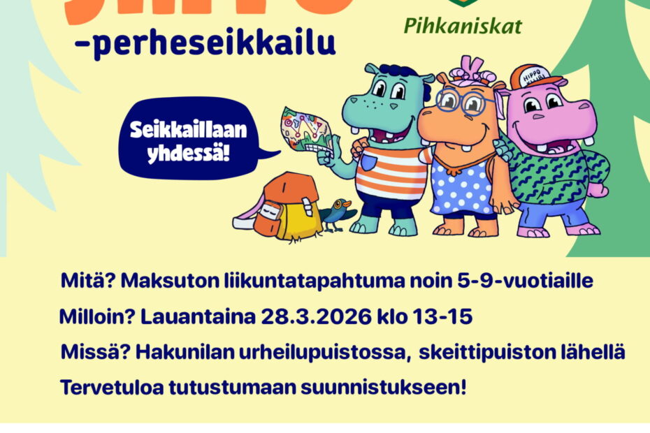 Tervetuloa mukaan Hippo-perheseikkailuun! Lauantaina 28.3.2026 Hakunilan urheilupuistossa pääsee tutustumaan suunnistukseen koko perheen voimin, kun Pihkaniskat järjestää maksuttoman Hippo-perheseikkailun pitkästä aikaa myös Vantaalla. Tapahtumassa voi kokeilla… Lue lisää »Hippo-perheseikkailu 28.3.